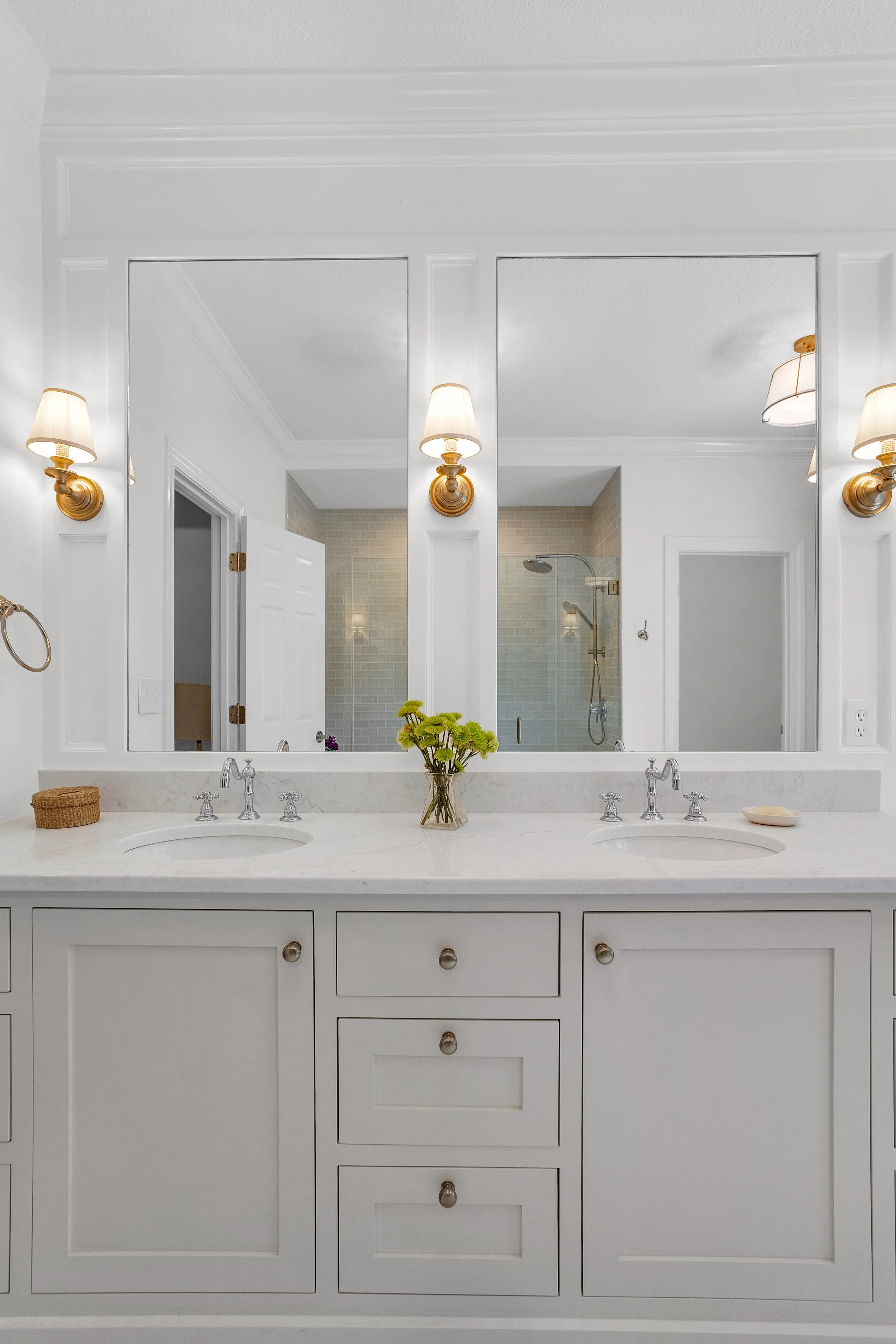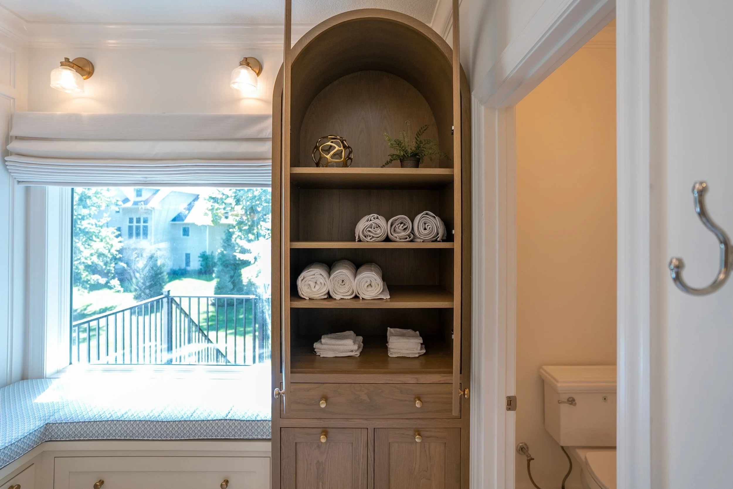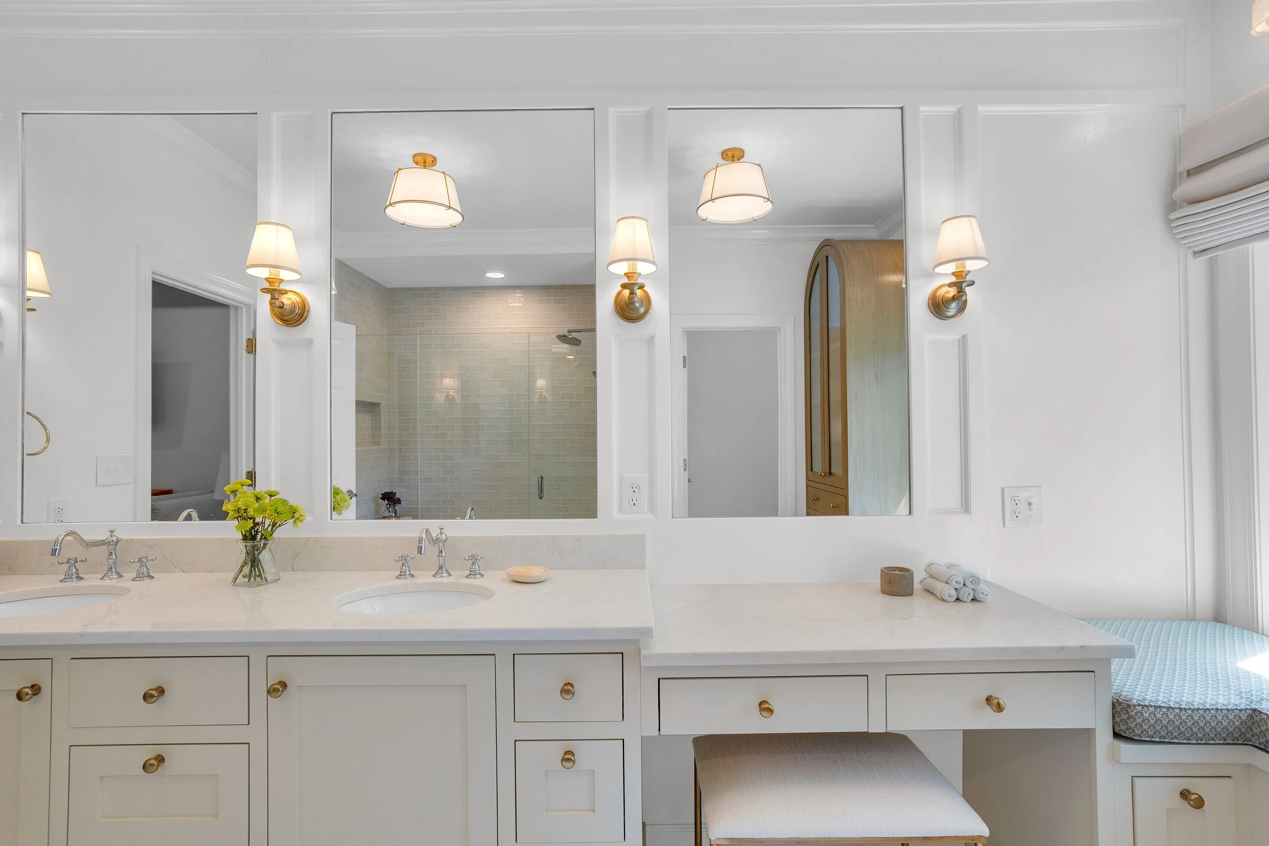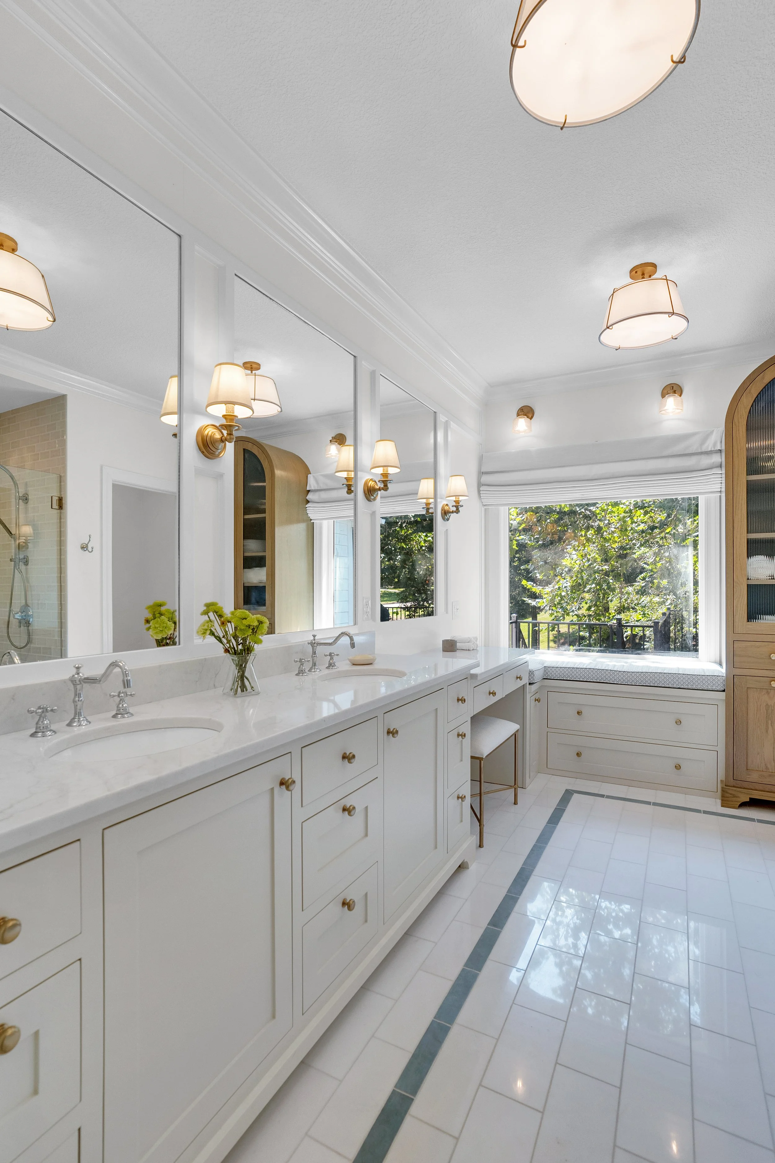Every detail came together to tell the story from the marble flooring with border accent tile to the custom cabinetry with ample storage to the generous vanity space to the trimmed-out vanity wall with embedded mirrors to the layers of accent lighting to the cozy window seat with a custom cushion-no detail was forgotten.